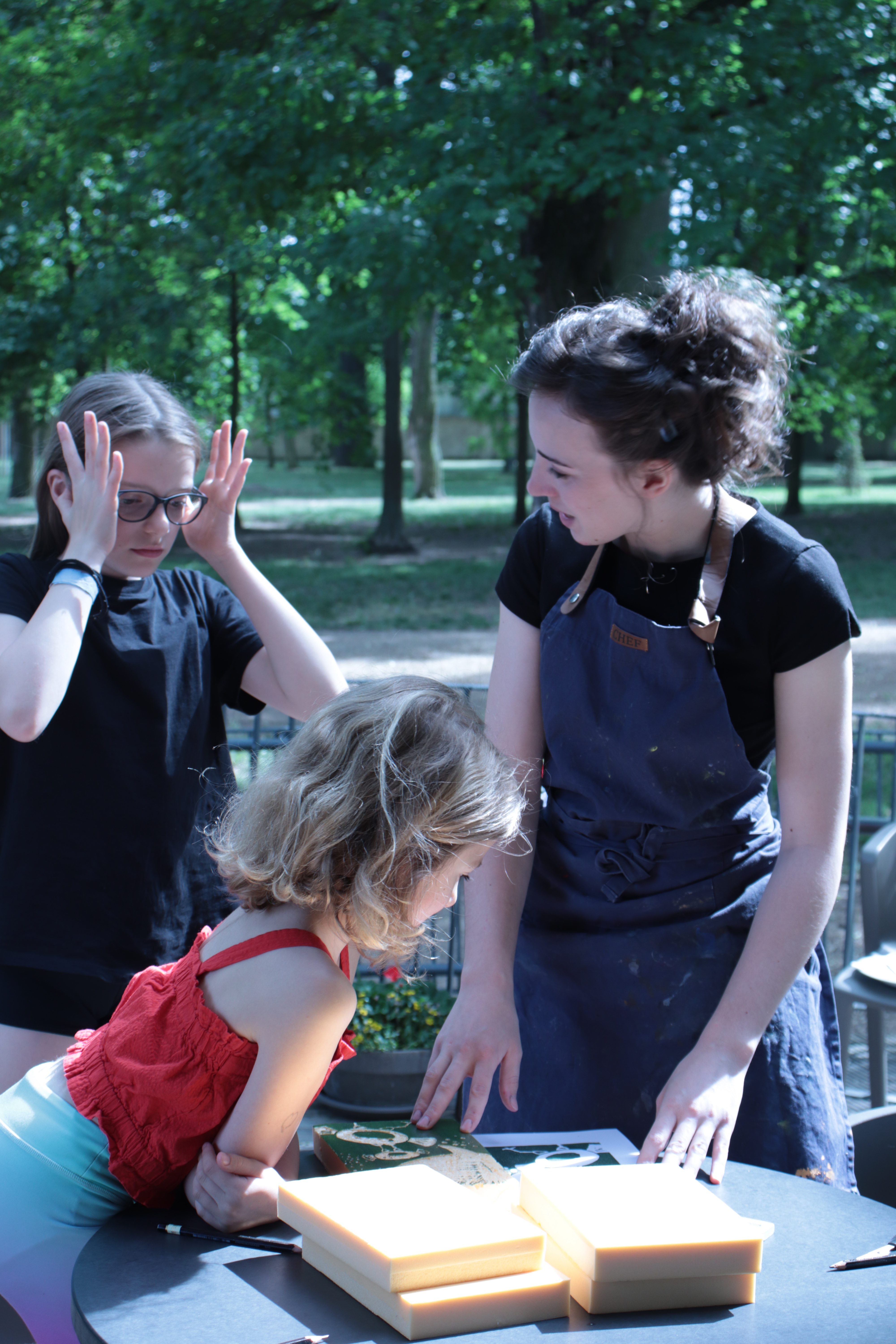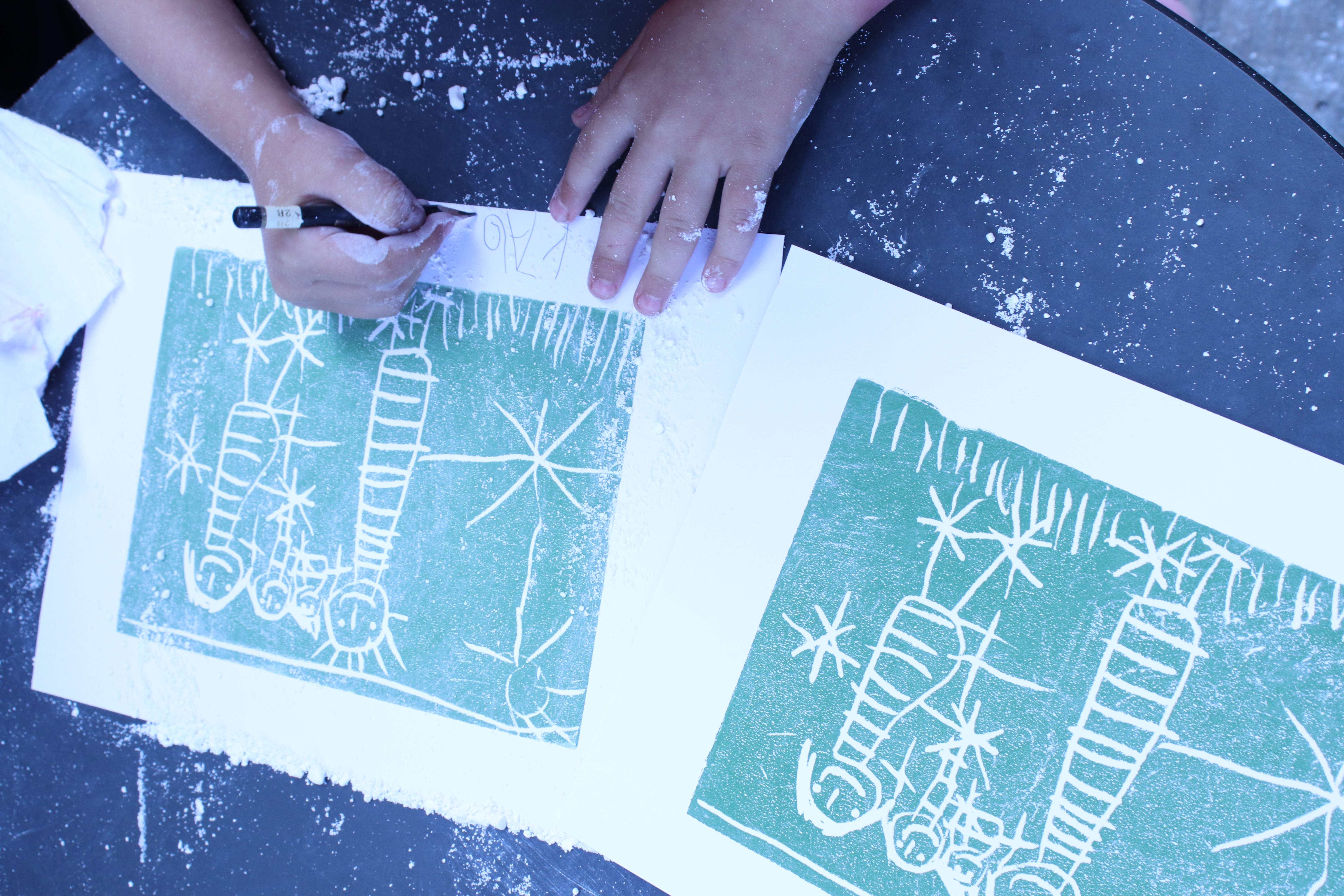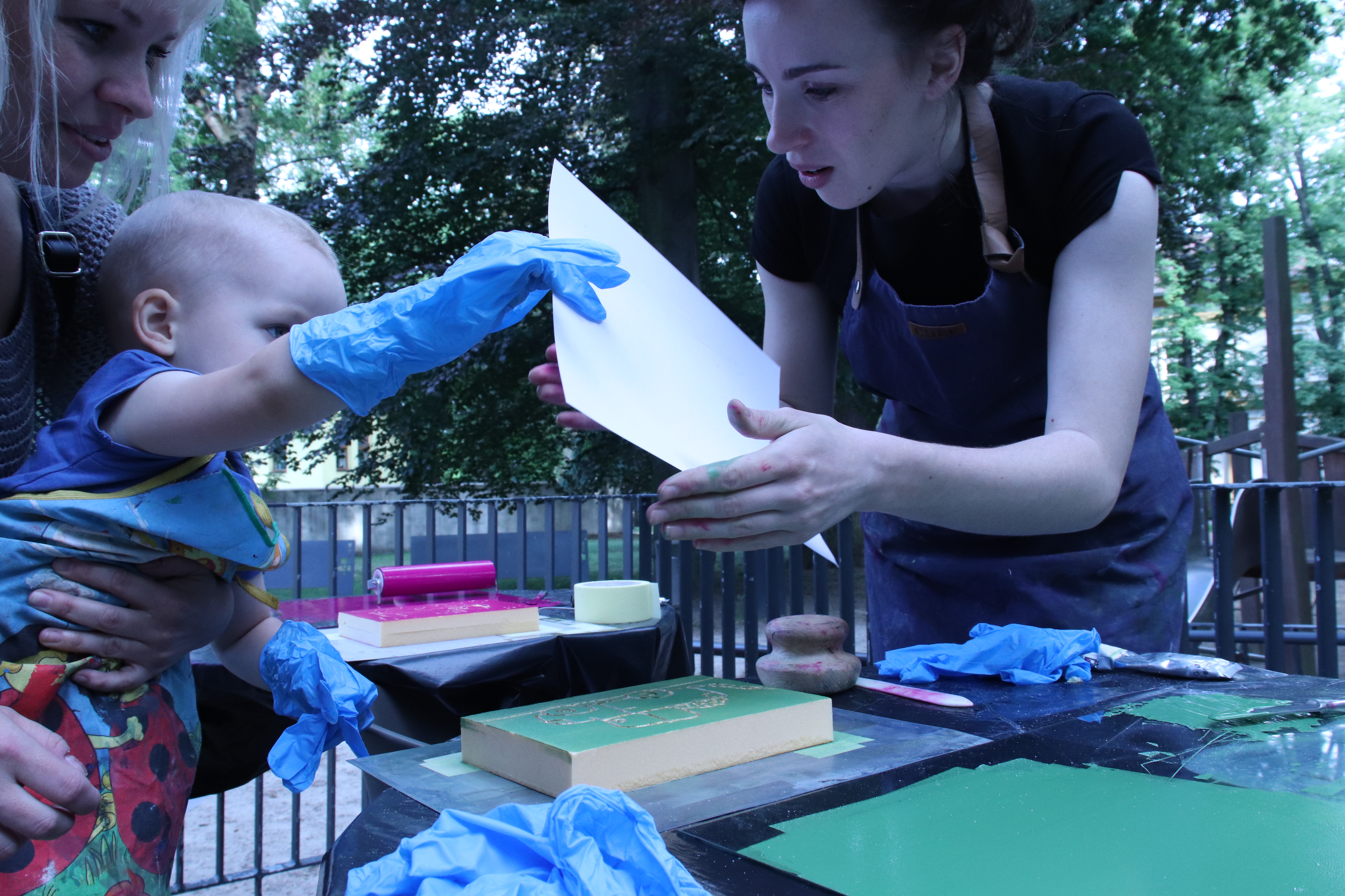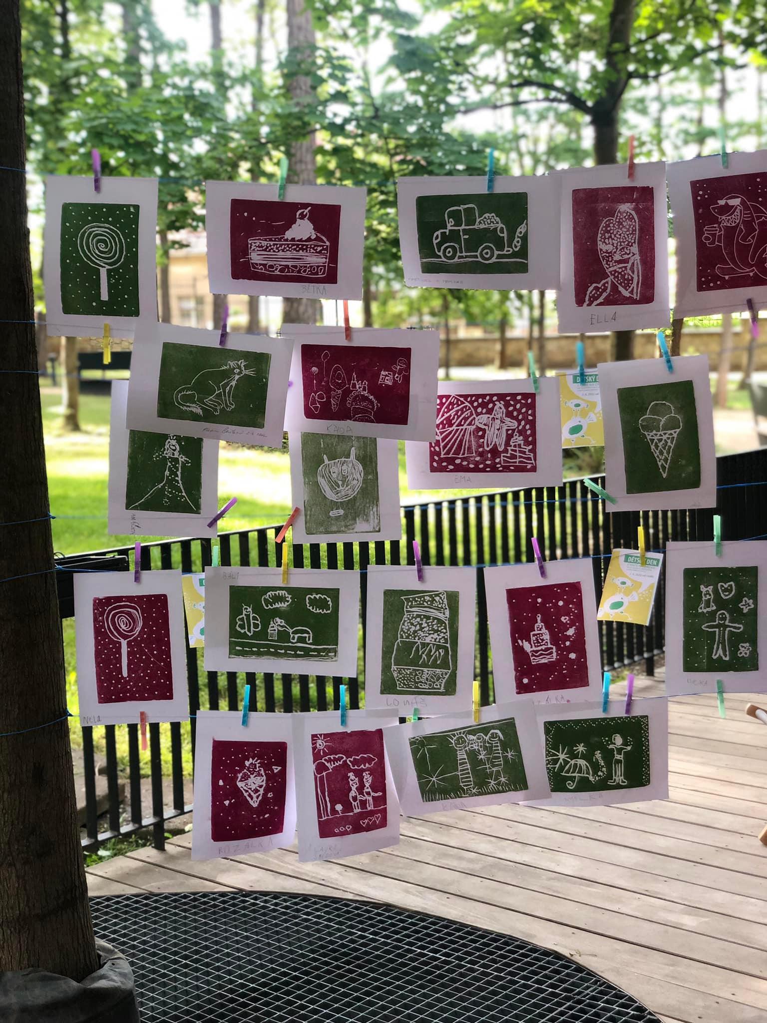 V roce 2023 jsme v kavárně …. organizovaly grafický workshop pro děti. Šlo o předvedení tisku z výšky za pomocí polystyrénových destiček. Výsledkem bylo 28 barevných tisků, které pak byly vystaveny v kavárně.